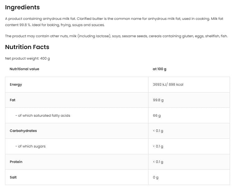 Gereinigte Butter ist ein Naturprodukt mit einem hohen Gehalt an einfach ungesättigten Fettsäuren und eignet sich daher ideal zum Kochen und Backen. Sie enthält wichtige Nährstoffe, die den Stoffwechsel und die Vitaminaufnahme unterstützen. Die Verwendung von geklärter Butter kann zur Verbesserung der Herzgesundheit beitragen, indem sie den Cholesterinspiegel reguliert und die Durchblutung verbessert.