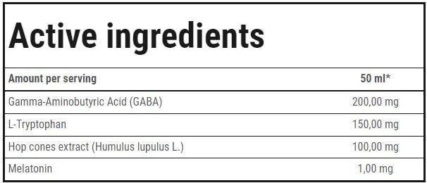 ZUTATEN: Wasser; Säureregulator – Zitronensäure; Gamma-Aminobuttersäure (GABA); L-Tryptophan; Hopfen-Strobila-Extrakt (Humulus lupulus L.); Süßstoffe – Acesulfam K, Sucralose, Neotam; Aromen; Konservierungsstoffe – Kaliumsorbat, Natriumbenzoat; Maltodextrin; Melatonin.