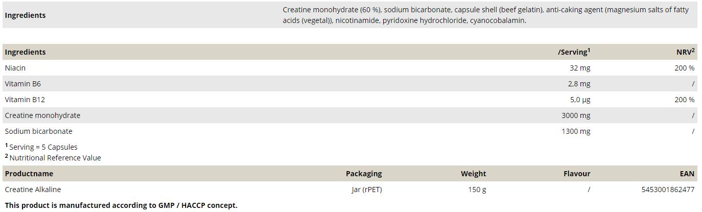 Gebrauchsanweisung: Alkalyn Creatine – 5 Kapseln täglich (am besten zum Abschluss oder nach dem Training) mit ca. 300 ml Flüssigkeit. An trainingsfreien Tagen 5 Kapseln morgens auf nüchternen Magen.
