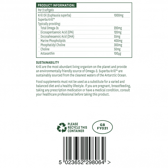Natures Aid Antarktisches Krillöl Superba wird aus Zooplankton aus den saubersten Gewässern des Antarktischen Ozeans gewonnen und ist vom British Council for Sustainable Sea Basin Development zertifiziert. Geschmacks- und geruchsneutrale, leicht zu schluckende Weichkapseln. Krillöl ist eine ausgezeichnete Quelle für Omega-3-Fettsäuren, einschließlich EPA und DHA. Es zeichnet sich durch eine hohe Konzentration an Phospholipiden aus, wodurch es vom Körper leichter verwertet werden kann – weniger als Fischöl, da Omega-3-Fettsäuren in Fischöl im Allgemeinen in Form von Triglyceriden gespeichert sind. Krillöl enthält Phosphatidylcholin und Astaxanthin. Phosphatidylcholin ist das wichtigste Phospholipid im menschlichen Körper und ein Baustein der Zellmembranen. Es ist an verschiedenen Prozessen im Körper beteiligt, beispielsweise am Transport von Fetten von der Leber in den Blutkreislauf. Unterstützt die Gesundheit der Leber und ihre Funktionen. Astaxanthin ist ein natürliches Carotinoid, das aufgrund seiner einzigartigen Struktur eine breite Palette antioxidativer Vorteile bietet. Da Astaxanthin die Blut-Hirn- und Blut-Netzhaut-Schranke überwinden kann, bietet es einen starken antioxidativen Schutz direkt für Augen, Gehirn und Nervensystem. Die entzündungshemmenden Eigenschaften von Omega-3-Fettsäuren schützen vor Herz-Kreislauf-Erkrankungen, Krebs und Typ-2-Diabetes. Sie verbessern die Durchblutung, senken Cholesterin und Blutdruck und unterstützen die Gesundheit der Gelenke.