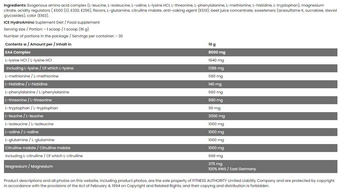 Fa Hydro Amino / Ice Serie ist ein großartiges, komplexes Nahrungsergänzungsmittel, das hohe Dosen von BCAA mit essentiellen Aminosäuren kombiniert. Das Produkt eignet sich für alle Sportler, die ihre Regeneration und ihren Tonus verbessern sowie unterstützen möchten Muskelaufbauprozesse in ihrem Körper.
