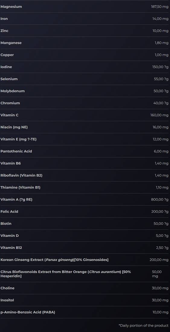 ZUSAMMENSETZUNG: Essentieller Mineralkomplex [Magnesiumoxid; Magnesiumcarbonat; Eisenfumarat; Maltodextrine; Zinksulfat; Mangansulfat; Kupfersulfat; Kaliumiodid; Chromchlorid; Natriummolybdat; Natriumselenat]; Stoffwechselverstärker [Koreanischer Ginseng-Extrakt (Panax ginseng) [10 % Ginsenoside]; Zitrus-Bioflavonoid-Extrakt aus Bitterorange (Citrus aurantium) [50 % Hesperidin]; Cholinbitartrat; Inositol; p-Aminobenzoesäure (PABA)]; Vitaminformel [Vitamin C (L-Ascorbinsäure); Niacin (Nicotinamid); Vitamin E (DL-Alpha-Tocopherylacetat); Pantothensäure (Calcium-D-pantothenat); Vitamin B6 (Pyridoxinhydrochlorid); Riboflavin; Thiamin (Thiaminmononitrat); Vitamin A (Retinylacetat); Folsäure (Pteroylmonoglutaminsäure); Biotin (D-Biotin); Vit. D (Cholecalciferol); Vit. B12 (Cyanocobalamin)]; Kapselhülle (Gelatine; Farbstoffe – Titandioxid, Eisenoxide und -hydroxide, Patentblau V); Trennmittel – Magnesiumsalze von Speisefettsäuren.