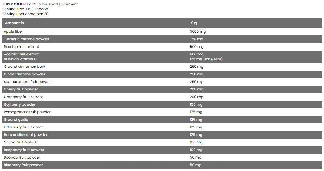 Die Zusammensetzung von FA SUPER IMMUNITY Booster ist eine präzise zusammengestellte Zusammensetzung aus Ballaststoffen, Gemüse, Obst und Gewürzen, die für ihre wertvolle Wirkung auf das Immunsystem bekannt sind. Die im Produkt verwendeten Zutaten sind natürliche Quellen wertvoller Wirkstoffe (wie Vitamin C und Polyphenole) mit positiver Wirkung auf den Zustand und die Funktion des Stoffwechsels. Die Produktformel ist völlig frei von Farbstoffen, Zucker und tierischen Zusatzstoffen – das Nahrungsergänzungsmittel ist für Veganer und Vegetarier geeignet. Die Formel ist als geschmacksneutrales und leicht lösliches Pulver erhältlich, das als Ergänzung zu anderen Präparaten verwendet werden kann.