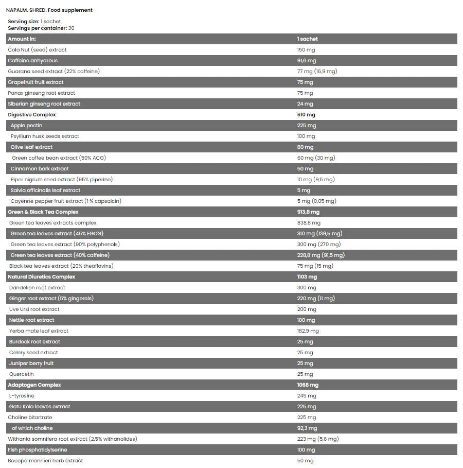 Xtreme Napalm Shred ist ein Fatburner mit einer sehr speziellen Formel, die einen Komplex aus Tee, Koffein, Guaranasamenextrakt und Ingwer enthält und Extrakte enthält, die harntreibend wirken und den Stoffwechsel ankurbeln.