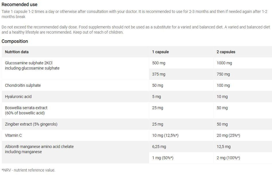 Zutaten: Albion, Hyaluronsäure, Boswellia-Extrakt, Ingwerwurzelextrakt, Glucosaminsulfat, Chondroitinsulfat