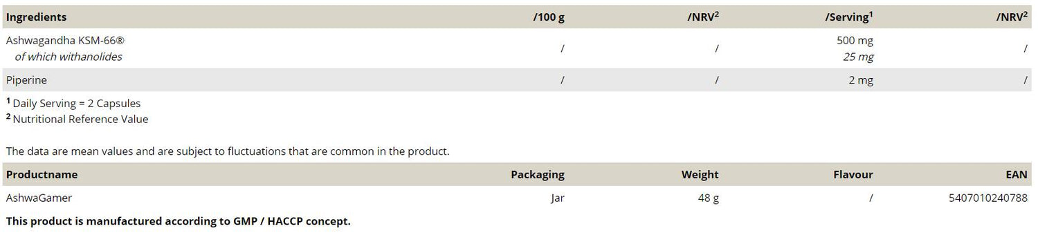 Ashwagamer | mit 500 mg Ashwagandha KSM -66® - 60 Kapseln