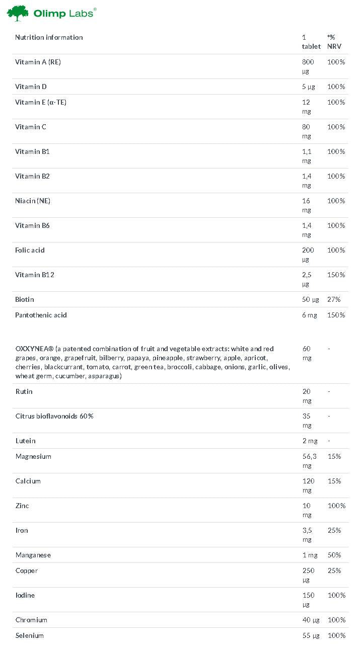 Dies erleichtert die Ergänzung des Bedarfs des Körpers an lebenswichtigen Mikronährstoffen. Es enthält außerdem Lutein, Rutin, Zitrus-Bioflavonoide und OXXYNEA ®, eine patentierte Mischung aus 22 Frucht- und Gemüseextrakten.